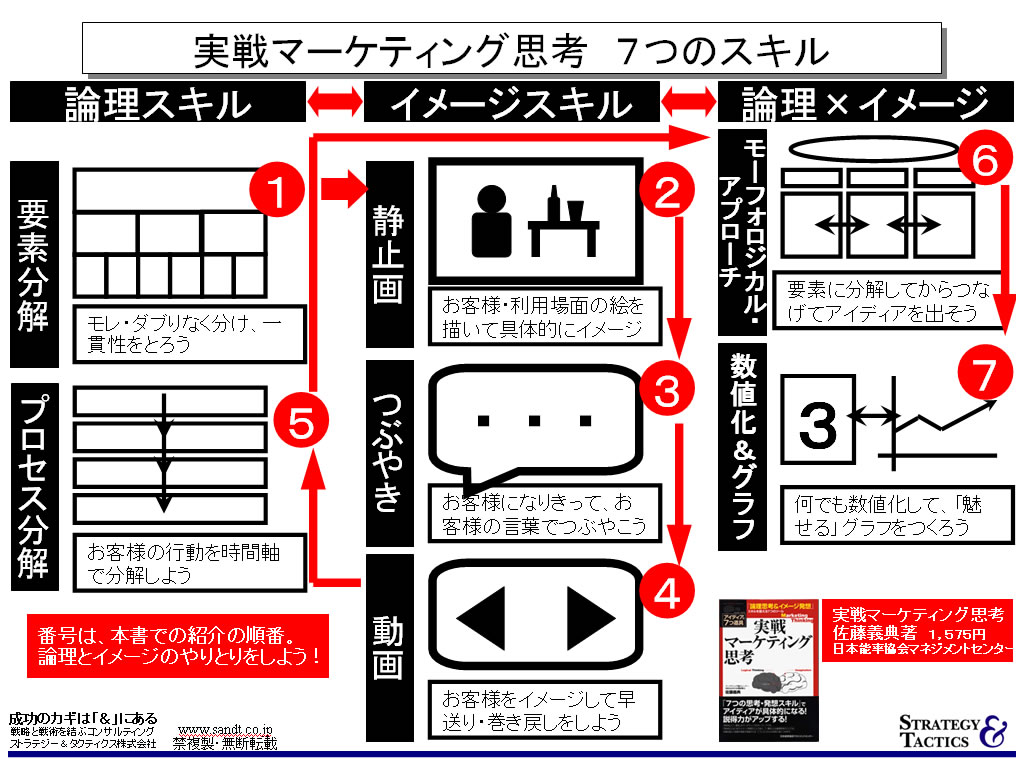 紹介の順番が変則的なのは、論理スキルとのイメージスキルを交互に使い、論理思考とイメージ発想の「やりとり」をするからです。それにより両者の弱点を補完し、「いいところ取り」をします。